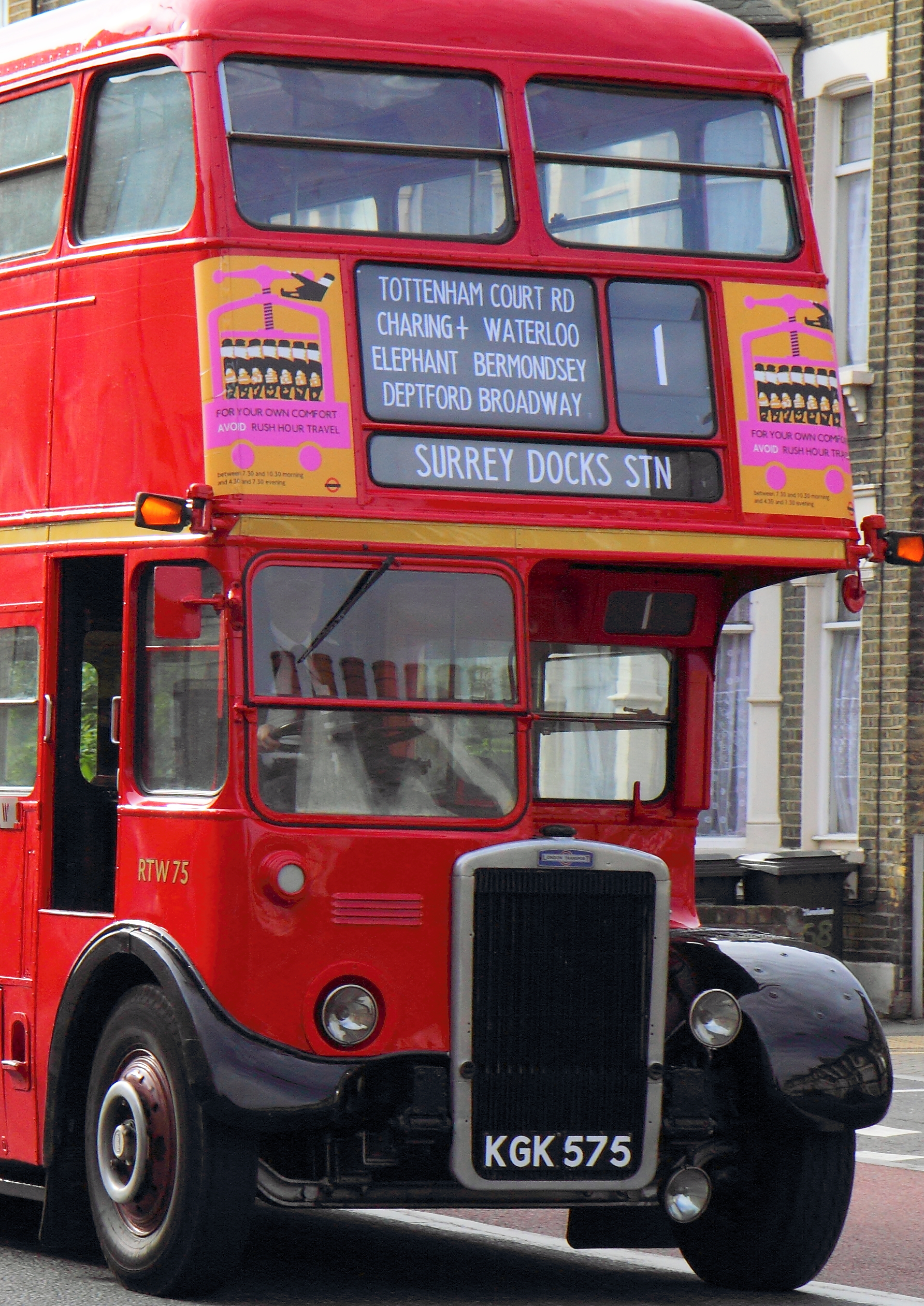 RTW75 showing early 1960s type blinds on paper, with a 4-line upper case intermediate points display for route 1, a feeder to the 2010 Colindale Running Day.