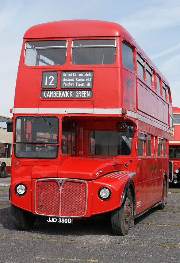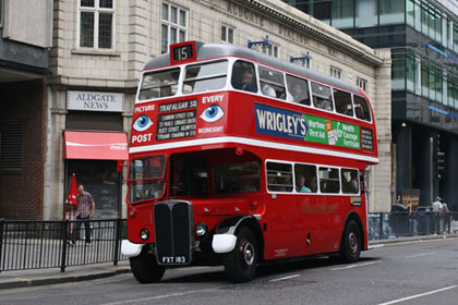 Ensignbus RT8 fitted with war-time style blinds on Tyvek, shown on its first formal trip, operating in service on route 15 during the summer of 2010.