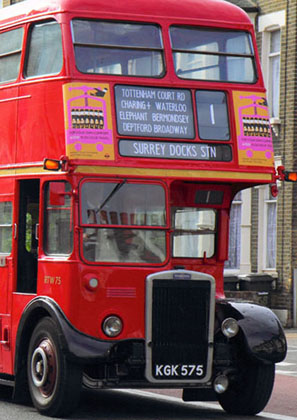 RTW 75 pictured on the 2010 Colindale Running Day displaying a 5-line route 18 intermediate points display in the style of the early 1950s. (photo by ©James Balchin.)