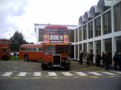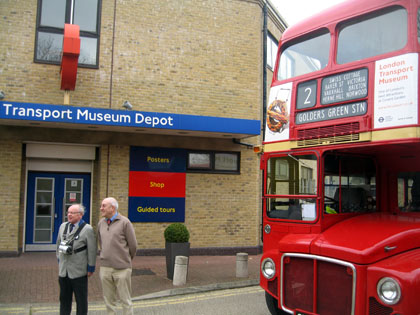 RM1 with its crew, Leon Daniels and Graham Smith, outside the LT Museum Depot at the start of the route 2 commemorative run on Sunday, 6th February, 2011, showing the period 1956 blinds meticulously researched and specially manufactured for the vehicle.